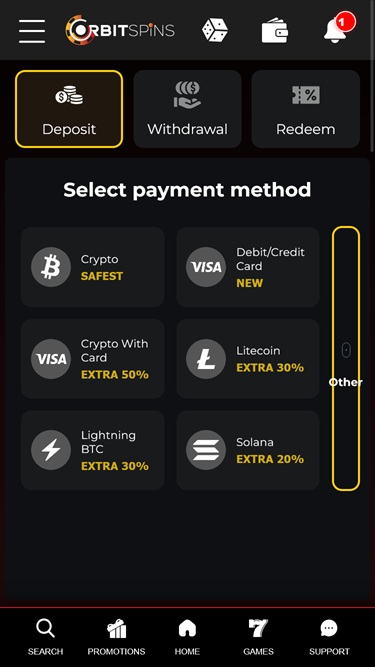 除了透過忠誠度VIP系統提供福利外,Orbit Spins賭場還致力於透過其推出的促銷計劃回饋玩家。誠然,大多數促銷活動都是為新玩家保留的,因此,如果您想在這裡建立帳戶,您可以獲得一些豐厚的獎金,包括存款匹配優惠。