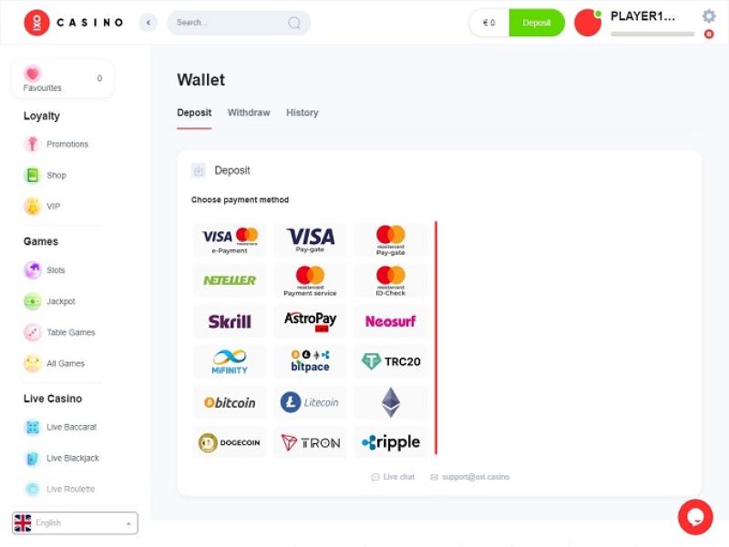 這是一個對加密貨幣友好的博彩品牌,也支援其他各種流行的銀行存款和提款方式。在OXI,玩家可以使用金融卡、信用卡和預付卡、電子錢包和即時電匯。