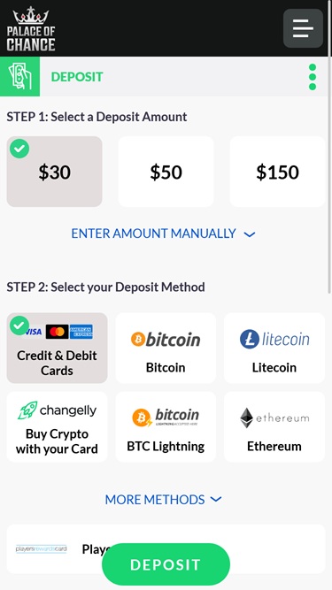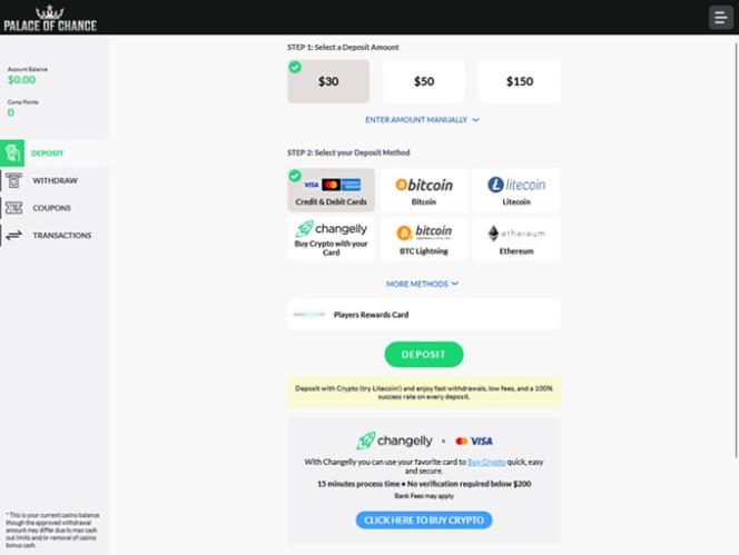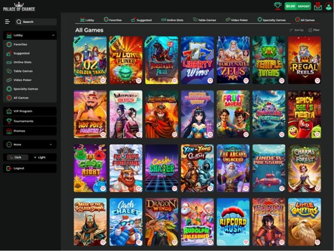 Palace of Chance Casino 由 Real Time Gaming and Spinlogic Gaming提供支持,它擁有一個基於網路的平台以及一個可供玩家用來存取賭場遊戲的可下載軟體。Baccarat
