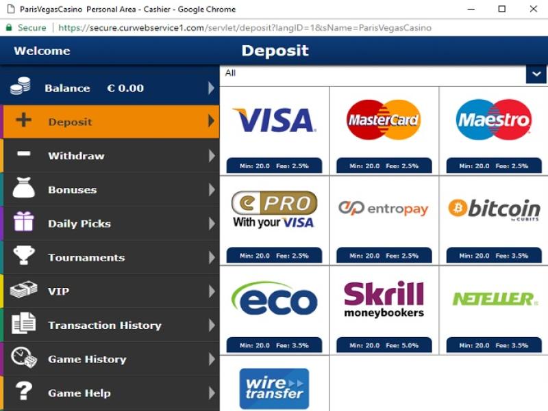 巴黎維加斯賭場由 NextGen and Skill on Net提供支持,其遊戲透過可下載的軟體以及允許透過網頁瀏覽器進行遊戲的即時遊戲平台提供。行動玩家也可以透過智慧型手機和平板電腦存取賭場。Banking銀⾏業務選項 的 Paris Vegas Casino
