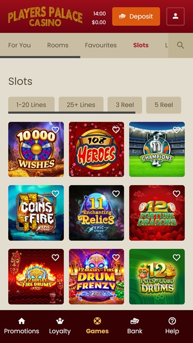 Players Palace 賭場由 Microgaming, Evolution Gaming, Rabcat, Pragmatic Play, Triple Edge Studios, Northern Lights Gaming, Stormcraft Studios, All41 Studios, Gameburger Studios, Pulse 8 Studios, Neon Valley Studios, SpinPlay Games, Real Dealer Studios, GONG Gaming, On Air Entertainment, Buck Stakes Entertainment, Games Global, Old Skool Studios, Foxium, Just For The Win, PearFiction Studios, Slingshot Studios, Fortune Factory Studios, Crazy Tooth Studio, Alchemy Gaming, Snowborn Games, Gold Coin Studios, Half Pixel Studios, Eurostar Studios and Aurum Signature Studios提供支持,為玩家提供超過 400 款遊戲的豐富遊戲庫。該賭場提供可下載的用戶端軟體和網頁平台兩種存取方式。想要在智慧型手機和平板電腦上暢玩賭場遊戲的玩家,可以透過 Players Palace 的行動網站進行存取。Baccarat
