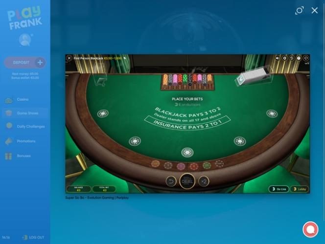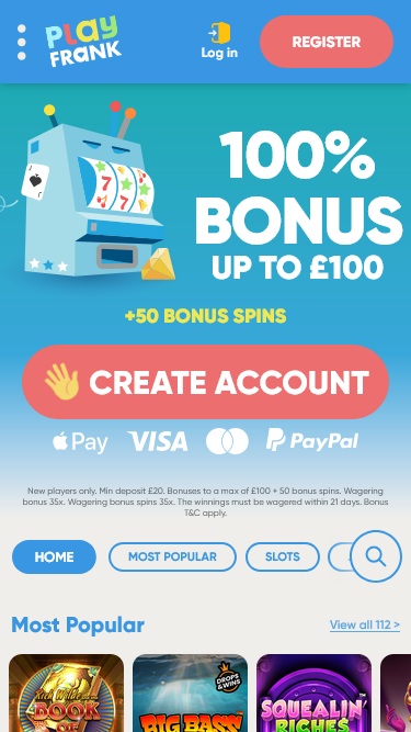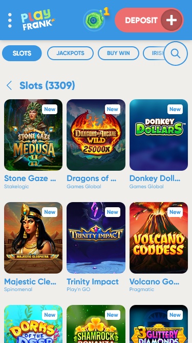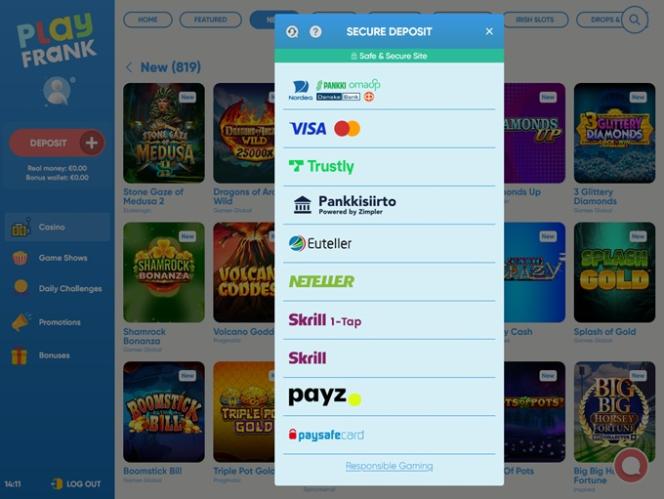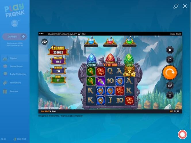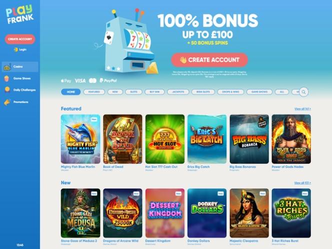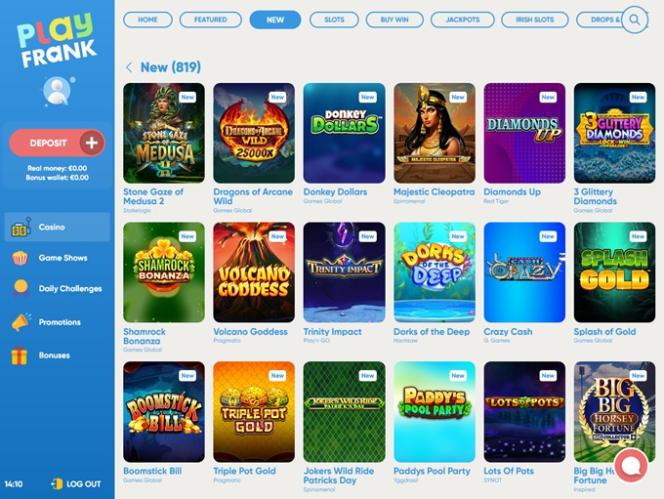 PlayFrank 賭場由 Amaya, Microgaming, Net Entertainment, BetSoft, 1x2gaming, Amatic Industries, Barcrest, Big Time Gaming, Evolution Gaming, EYECON, Ezugi, iSoftBet, lightningboxgames, Oryx, Play'n GO, playson, Quickspin, Rabcat, Yggdrasil, Wazdan, Realistic Games, Booming Games, Stakelogic, Pragmatic Play, GAMING1, Red Tiger Gaming, Spinomenal, Red Rake Gaming, Skillzzgaming, SYNOT Games, Skywind, Triple Edge Studios, Northern Lights Gaming, Stormcraft Studios, All41 Studios, Gluck Games, Gameburger Studios, Pulse 8 Studios, Neon Valley Studios, SpinPlay Games, GONG Gaming, Buck Stakes Entertainment, Games Global, Wizard Games, 2by2 Gaming, Ainsworth, Bally Technologies, bluberi, Blueprint Gaming, NextGen, Pariplay, Tom Horn Gaming, WMS, Inspired Gaming, Gaming Realms, SG Interactive, Gamomat, Scientific Games, Reel Time Gaming, betiXon, Bally Wulff, Old Skool Studios, Foxium, Betdigital, Just For The Win, PearFiction Studios, Wild Streak Gaming, Slingshot Studios, Fortune Factory Studios, RubyPlay, AvatarUX, Gamevy, Crazy Tooth Studio, High 5 Games, ReelPlay, Alchemy Gaming, Snowborn Games, Hacksaw Gaming, Bang Bang Games, Slotmill, Lucksome Gaming, Area Vegas, Leap Gaming, Wishbone Games, Spribe and HammerTime Games提供支持,使其擁有龐大的遊戲庫,並透過賭場的網路平台提供。行動網站也允許玩家透過智慧型手機和平板電腦玩遊戲。