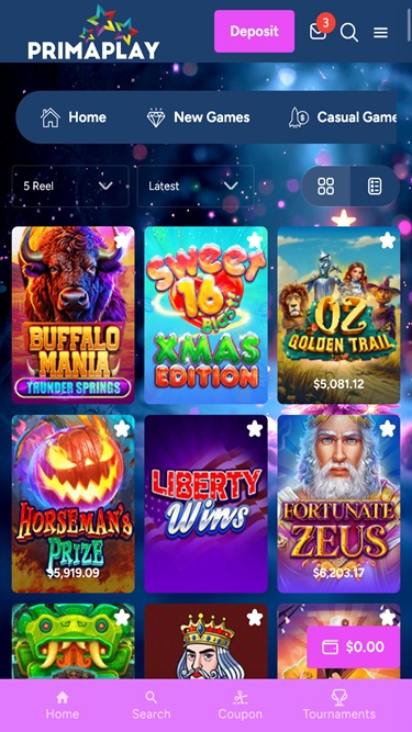 Prima Play Casino 由 Real Time Gaming and Spinlogic Gaming提供支持,該網站採用網頁平台,可透過網頁瀏覽器載入。雖然網站看起來不錯,但我注意到滾動瀏覽時速度有點慢。該網站也支援行動端遊戲,您可以在手機或平板電腦上暢玩。