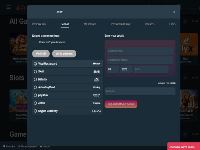 Banking銀⾏業務選項 的 PrimeBetz Casino