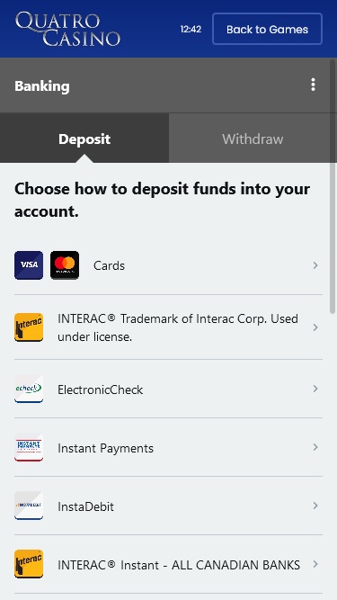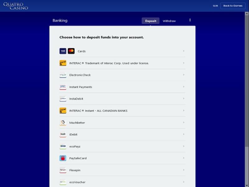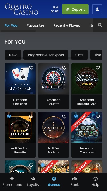 Quatro Casino 由 Microgaming, Evolution Gaming, Rabcat, Pragmatic Play, Triple Edge Studios, Northern Lights Gaming, Stormcraft Studios, Switch Studios, Electric Elephant Games, All41 Studios, Gameburger Studios, Pulse 8 Studios, Neon Valley Studios, SpinPlay Games, Real Dealer Studios, GONG Gaming, On Air Entertainment, Buck Stakes Entertainment, Games Global, Old Skool Studios, Foxium, Just For The Win, PearFiction Studios, Slingshot Studios, Fortune Factory Studios, Crazy Tooth Studio, Alchemy Gaming, Snowborn Games, Gold Coin Studios, Half Pixel Studios, Eurostar Studios, Aurum Signature Studios and Area Vegas提供支持,為玩家提供多種線上賭場遊戲。賭場軟體透過網頁平台提供,也提供可下載的客戶端,方便喜歡直接在電腦上使用的玩家。 Quatro Casino 是一個功能齊全的行動遊戲網站,提供豐富的遊戲選擇,玩家還可以透過行動裝置暢玩。Baccarat