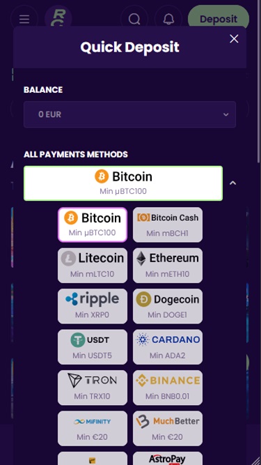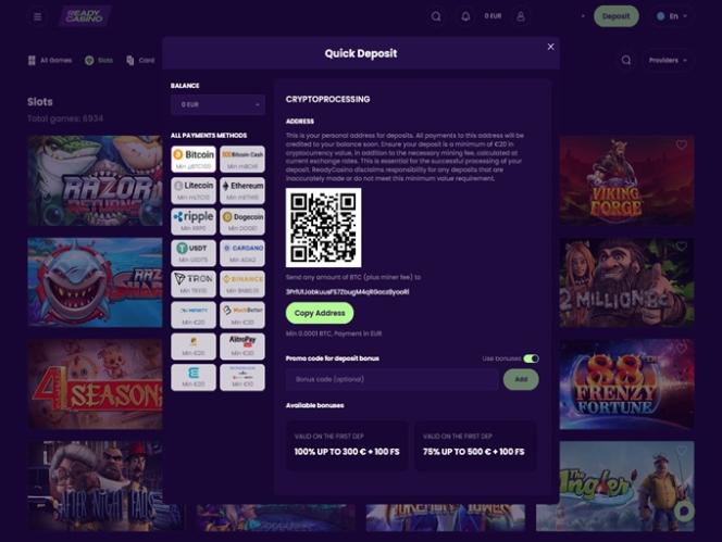 在主頁的最底部,您可以看到在 Ready Casino 存款和提款時可以使用哪些付款方式,以及負責任賭博、條款和條件、客戶支援、遊戲規則和隱私權政策等標準頁面。