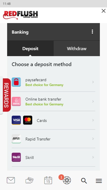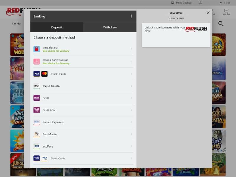 Red Flush 賭場由 Microgaming, Net Entertainment, Evolution Gaming, Triple Edge Studios, Stormcraft Studios, Switch Studios, Pulse 8 Studios, Games Global, Just For The Win and Fortune Factory Studios提供支持,提供數百款遊戲以及託管賭場所有服務的卓越遊戲平台。賭場可透過可下載的客戶端軟體或網頁平台訪問,兩者的功能基本上相同。此外,還提供行動賭場,方便那些想在智慧型手機或平板電腦上博彩的玩家。