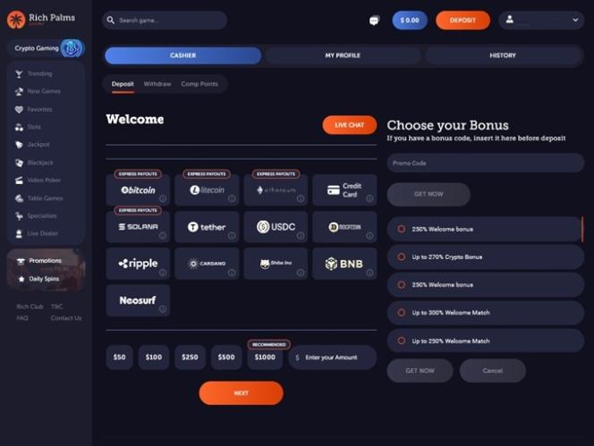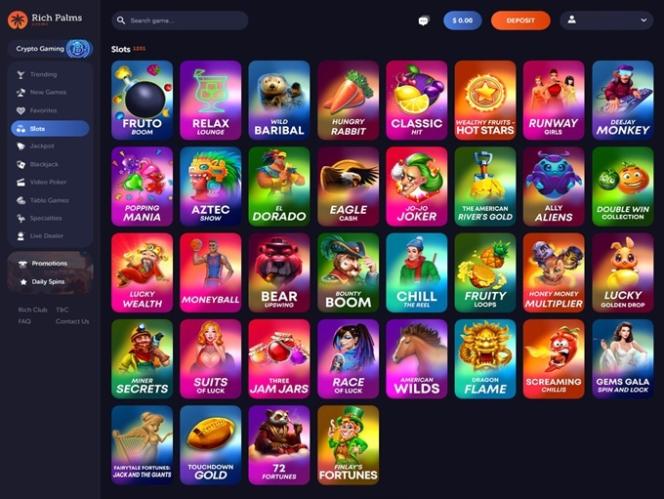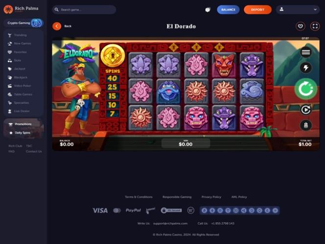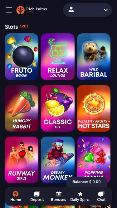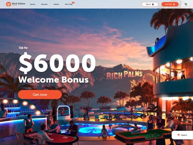 Rich Palms 賭場由 BetSoft, Rival, Saucify, Visionary iGaming, Betgames, Nucleus Gaming, Spadegaming, BGAMING, CQ9 Gaming, Woohoo Games, Qora Games, Genii, Wager Gaming, Dragon Gaming, Dragoon Soft and Urgent Games提供支持,玩家可以透過其網頁平台獲取信息,該平台可透過您常用的互聯網瀏覽器加載。該網站還支援行動端遊戲,因此使用智慧型手機或平板電腦進行博彩也毫無問題。