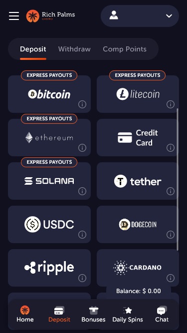 Rich Palms Casino 的銀行業務處理速度太慢了,我不太滿意。付款可能需要超過 7 個工作天才能到賬,時間太長了。該賭場每週的提現限額為 2,000 美元,網站保留將付款拆分成多筆交易的權利。這是一個需要改進的地方。