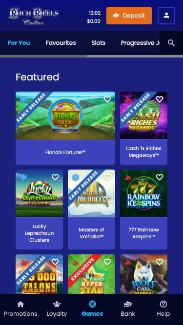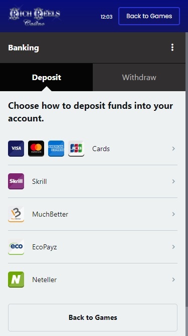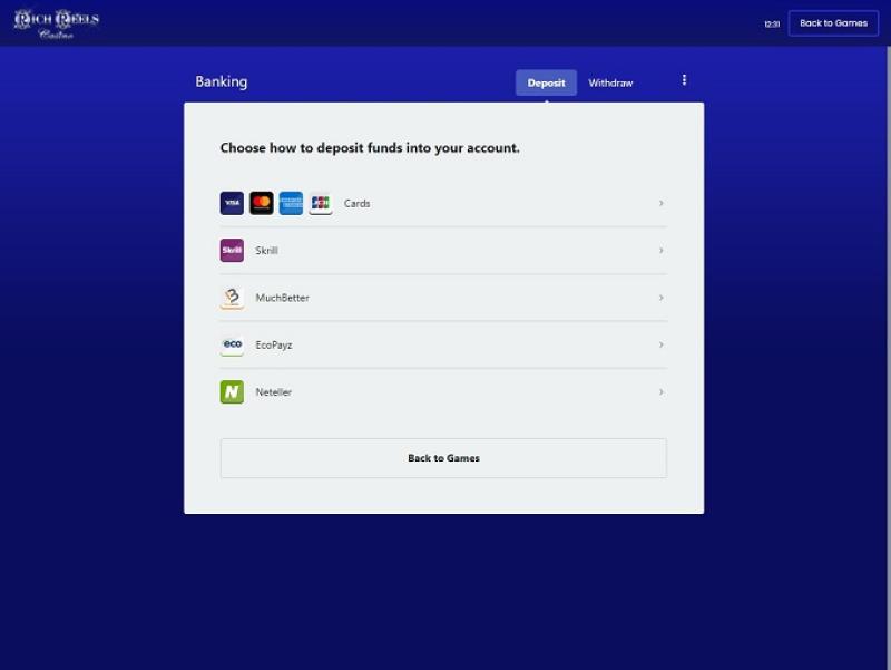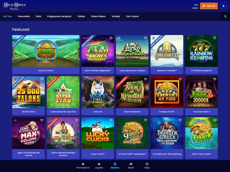 Rich Reels 賭場由 Microgaming, Evolution Gaming, Rabcat, Pragmatic Play, Triple Edge Studios, Northern Lights Gaming, Stormcraft Studios, Switch Studios, Electric Elephant Games, All41 Studios, Gameburger Studios, Pulse 8 Studios, Neon Valley Studios, SpinPlay Games, Real Dealer Studios, GONG Gaming, On Air Entertainment, Buck Stakes Entertainment, Games Global, Old Skool Studios, Foxium, Just For The Win, PearFiction Studios, Slingshot Studios, Fortune Factory Studios, Crazy Tooth Studio, Alchemy Gaming, Snowborn Games, Gold Coin Studios, Half Pixel Studios, Eurostar Studios, Aurum Signature Studios and Area Vegas提供支持,為玩家提供數百款遊戲。 Microgaming 也為該賭場的平台提供支持,包括可下載的客戶端軟體以及一個非常出色的網頁平台,可讓您直接透過網頁瀏覽器玩遊戲。想要在行動裝置上玩遊戲的玩家可以透過 Rich Reels 的行動博弈網站進行遊戲。Baccarat