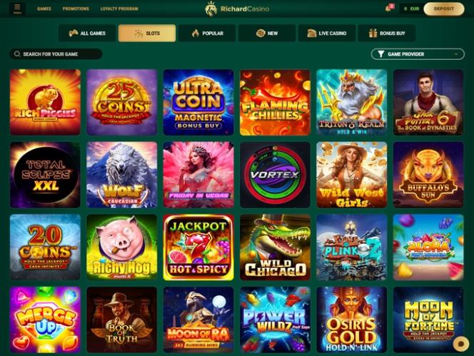 接下來,我們想看看理查德賭場 (Richard Casino) 有哪些遊戲選項。眾所周知,任何線上博彩平台最重要的因素是其為玩家提供的產品庫。雖然遊戲設計、獎金和其他功能固然重要,但我們來這裡的目的都是為了體驗一些有趣的遊戲。