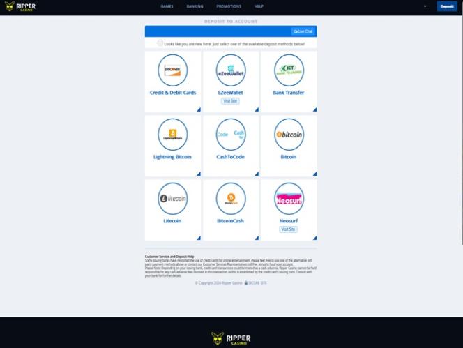 Ripper 的出納和銀行業務選項豐富多樣,提供多種存款和提款支付方式。這個針對美國玩家的遊戲網站支援加密貨幣以及其他支付方式,例如支付卡和許多玩家喜愛的電子錢包。