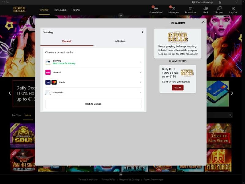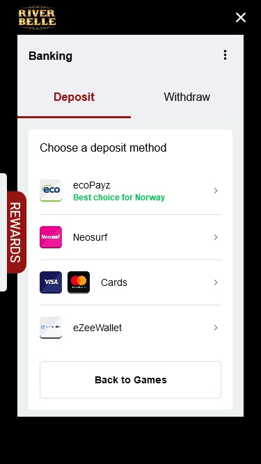 River Belle 賭場由 Microgaming, Net Entertainment, Evolution Gaming, Ezugi, Rabcat, Pragmatic Play, Red Tiger Gaming, Triple Edge Studios, Northern Lights Gaming, Stormcraft Studios, Switch Studios, Electric Elephant Games, All41 Studios, Gameburger Studios, Pulse 8 Studios, Neon Valley Studios, SpinPlay Games, Real Dealer Studios, GONG Gaming, On Air Entertainment, Buck Stakes Entertainment, Games Global, Old Skool Studios, Foxium, Just For The Win, PearFiction Studios, Wild Streak Gaming, Slingshot Studios, Fortune Factory Studios, Crazy Tooth Studio, Alchemy Gaming, Snowborn Games, Gold Coin Studios, Half Pixel Studios, Eurostar Studios and Aurum Signature Studios提供支持,擁有超過 400 款遊戲。您可以透過可下載的用戶端軟體和網頁平台造訪賭場,後者可讓您直接透過網頁瀏覽器進行遊戲。此外,它還設有行動網站,方便您透過平板電腦或智慧型手機暢玩賭場遊戲。
