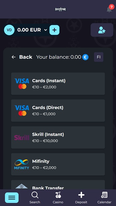 Banking銀⾏業務選項 的 RockstarWin Casino