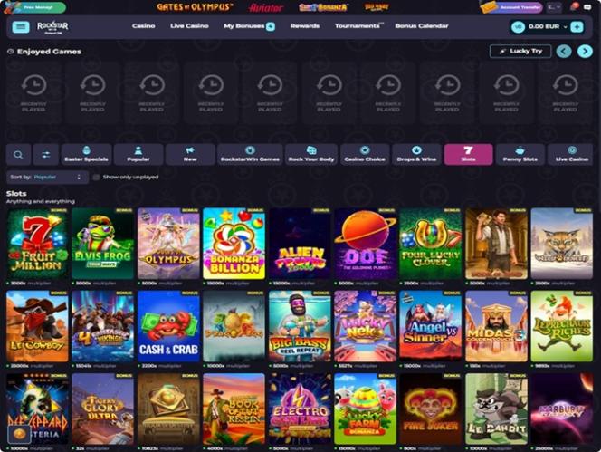 儘管 RockstarWin 賭場擁有豐富的桌上遊戲、真人荷官和眾多特色遊戲,但不可否認的是,他們的線上老虎機才是最受玩家歡迎的。如果您正在尋找一家能夠提供數千台精彩老虎機的賭場,那麼這裡就是您的理想之選。不妨考慮從以下遊戲開始: