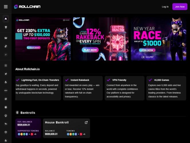 這家賭場與許多熱門遊戲工作室合作,合作夥伴名單星光熠熠,包括Evolution Gaming、NetEnt、Novomatic、Relax Gaming和Pragmatic Play等業內巨頭。這些以及其他眾多賭場軟體開發商為Rollchain提供高品質的遊戲和豐富的娛樂體驗。在這裡,玩家可以瀏覽豐富的遊戲庫,並體驗定期更新的新遊戲。