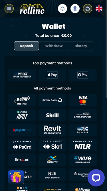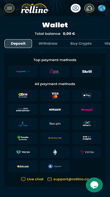 收銀員支援多種廣泛使用的付款方式,包括信用卡和金融卡、電子錢包(如Neteller 和 Skrill) 、加密貨幣支付和其他流行的網路銀行選項。