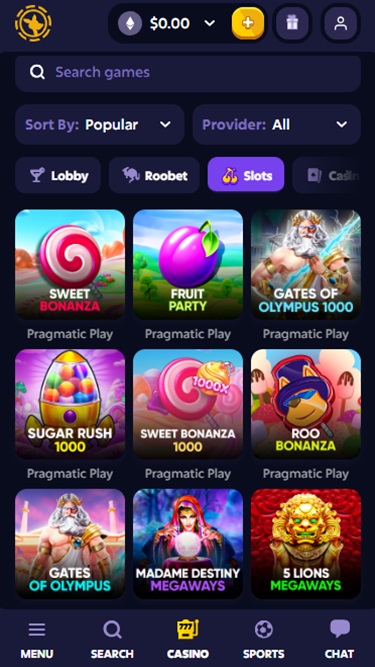 Roobet 是一家現代化的線上賭場,在遊戲種類和運動博彩方面表現不俗。您可以暢玩各式各樣的線上老虎機、真人荷官、桌上遊戲和速成遊戲。豐富的運動博彩內容讓您可以投注各種體育賽事和電子競技賽事。