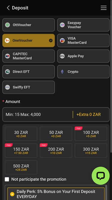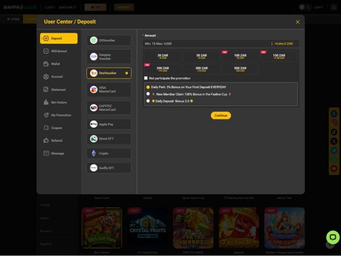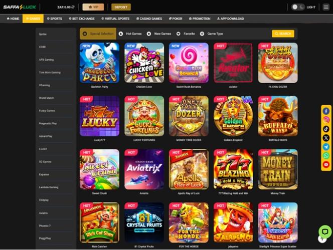 顧名思義,SaffaLuck 是一家主要面向南非玩家的線上賭場,旨在透過提供種類繁多的賭場遊戲和體育博彩選項來吸引大量玩家,其中包括數百款真錢老虎機、即時崩潰遊戲、真人荷官遊戲和桌面遊戲,同時還提供一系列強大的促銷活動和獎金。