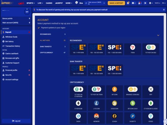 為了從賭場帳戶存款和提款,Sapphirebet 的玩家可以使用多種銀行選項,包括Visa 、 Mastercard 、 Jeton 、 Neosurf 、 Payz 、 Flexepin 、 MuchBetter 、 Paytm 、 Astropay ,以及多種加密貨幣,如比特幣、比特幣現金、卡萊諾、狗狗幣、歐羅幣Tether , Uther , Coin 特幣、 Bple