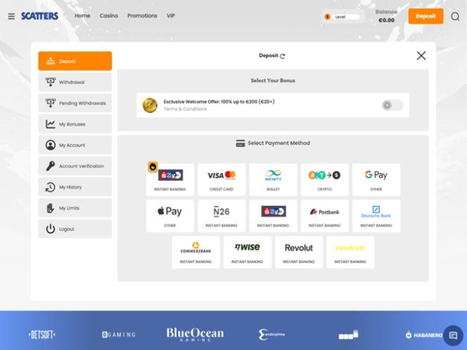 Scatters 由 BetSoft, Ezugi, Habanero Systems, Play'n GO, playson, Quickspin, Thunderkick, Vivo Gaming, Yggdrasil, Endorphina, Wazdan, Pragmatic Play, Nolimit City, Spinomenal, Red Rake Gaming, Platipus Gaming, BGAMING, Fazi, Evoplay, Pocket Games Soft, Bulletproof Games, Gluck Games, Mancala Gaming, 7Mojos, HungryBear Gaming, UP Games, Tom Horn Gaming, BlueOcean Gaming, Reflex Gaming, Wild Streak Gaming, 4ThePlayer, AvatarUX, Gamevy, ReelPlay, Boomerang Studios, Hacksaw Gaming, Bang Bang Games, Peter And Sons, Absolute Live Gaming, Religa, TaDa Gaming, Winfinity, Spribe, 1spin4win, Reel Kingdom, NowNow Gaming, VoltEnt and Kitsune Studios提供支持,賭場遊戲透過網頁平台提供,可直接透過您的網路瀏覽器載入。網站介面美觀,易於瀏覽,還支援行動端,方便您使用智慧型手機或平板電腦進行博彩。