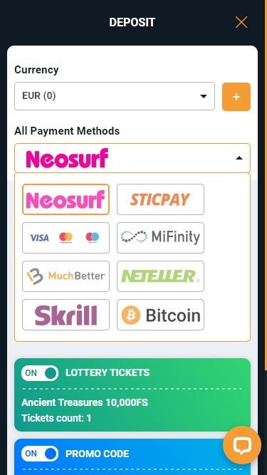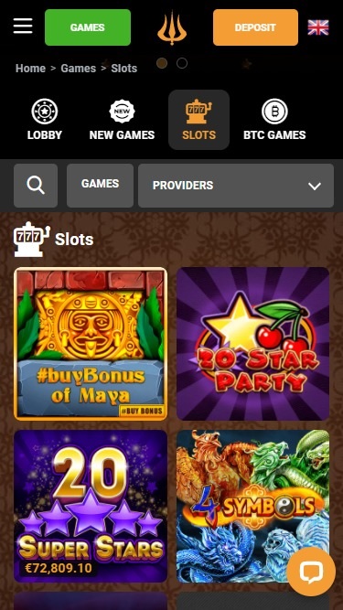 遊戲分為多個有序的部分:老虎機、BTC 遊戲、累積獎金、視訊撲克、彩票、真人娛樂場…