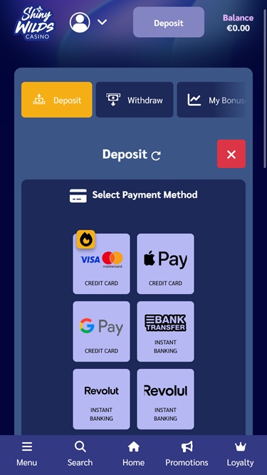 Shiny Wild Casino 的提現流程包含「了解您的客戶」驗證,通常最多需要 24 小時。您的提現請求提交後,將進入待處理階段,最長可能需要 48 小時才能處理完畢。申請批准後,支付處理時間將額外延長 24 小時,以確保資金及時轉入您首選的付款方式。