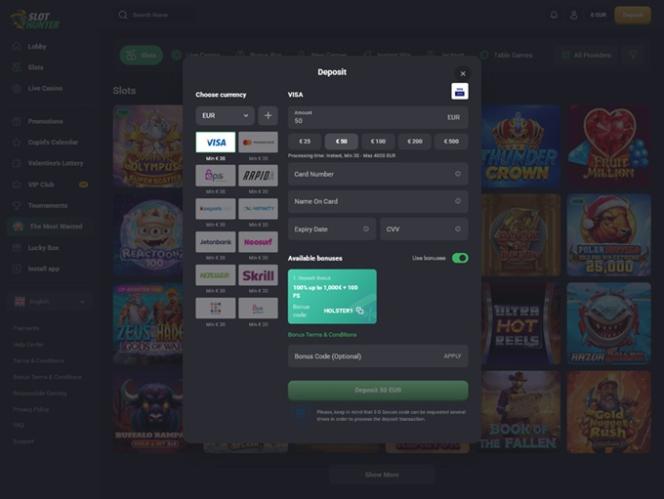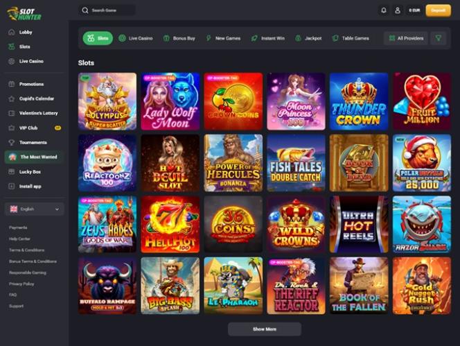 Slot Hunter 由 Microgaming, Net Entertainment, Playtech, BetSoft, 1x2gaming, Amatic Industries, Big Time Gaming, ELK Studios, Evolution Gaming, EYECON, Habanero Systems, Novomatic, Oryx, Play'n GO, playson, Relax Gaming, Thunderkick, Yggdrasil, Endorphina, Wazdan, Realistic Games, Booming Games, Pragmatic Play, Nolimit City, Red Tiger Gaming, LuckyStreak, Spinomenal, Red Rake Gaming, Skillzzgaming, Fugaso, Fantasma Games, Kalamba, Revolver Gaming, Spin Games, Platipus Gaming, Skywind, Spadegaming, Triple Edge Studios, BGAMING, Northern Lights Gaming, Evoplay, Stormcraft Studios, Switch Studios, Electric Elephant Games, Pocket Games Soft, Bulletproof Games, All41 Studios, Gluck Games, Mascot Gaming, Gameburger Studios, Pulse 8 Studios, Slot Factory, Neon Valley Studios, Golden Rock Studios, Spearhead Studios, Swintt, TrueLab Games, SpinPlay Games, HungryBear Gaming, SmartSoft Gaming, Real Dealer Studios, GONG Gaming, Holle Games, Buck Stakes Entertainment, Caleta Gaming, Games Global, Amusnet Interactive, Ash Gaming, Greentube, Push Gaming, Gamomat, BF Games, Bally Wulff, Iron Dog Studio, Old Skool Studios, Foxium, Just For The Win, Reflex Gaming, PearFiction Studios, Wild Streak Gaming, Slingshot Studios, Golden Hero, Fortune Factory Studios, RubyPlay, 4ThePlayer, AvatarUX, Gamevy, Crazy Tooth Studio, ReelPlay, Japan Technicals Games, Alchemy Gaming, Rarestone Gaming, Black Pudding Games, Snowborn Games, Boomerang Studios, Hacksaw Gaming, Max Win Gaming, Gold Coin Studios, Bang Bang Games, Half Pixel Studios, Slotmill, Peter And Sons, Aurum Signature Studios, Area Vegas, TaDa Gaming, Wishbone Games, Apparat Gaming, Spribe, Circular Arrow, Print Studios, Gaming Corps, HammerTime Games, Four Leaf Gaming, INO Games, Nailed It! Games, Atomic Slot Lab, Neko Games, Reel Kingdom, Oros Gaming, Givme Games, JVL, Indigo Magic, Zillion Games, Galaxsys, NowNow Gaming, Kitsune Studios, Sneaky Slots and Octoplay提供支持,賭場遊戲透過基於瀏覽器的解決方案提供,您可以使用自己喜歡的瀏覽器存取。您也可以使用手機或平板電腦造訪該網站,因為網站已完全內建支援。Baccarat