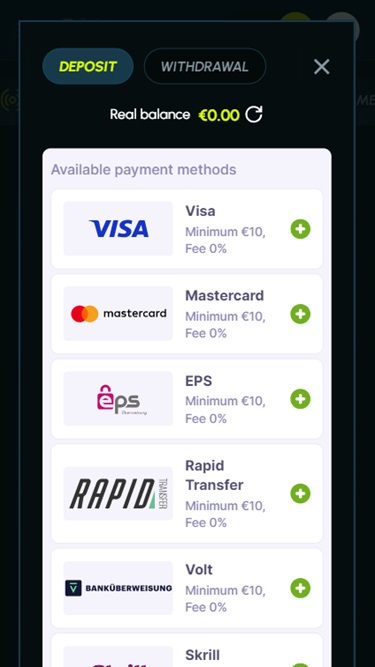 您可以在這裡使用多種付款方式進行存款和提款。傳統方式包括Visa 、 Mastercard 、 Skrill 、 Neteller 、 Jeton 、 Paysafecard 、 Payz 、 Astropay 、 Mifinity等。此外,現代支付方式還包括比特幣、狗狗幣、以太幣、萊特幣、 Solana 、 USD Coin和Tether等加密貨幣。