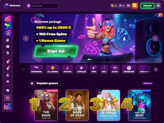 Slotrave Casino是一家主要針對加拿大 、德國、瑞士和奧地利 玩家的線上賭場。網站介面精美生動,並提供捷克語、德語、希臘語、英語、西班牙語、法語、匈牙利語等多種語言版本。