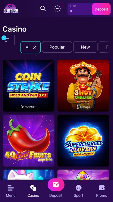 我們始終專注於賭場部分,但正如我們之前提到的,SlotRush 也包含體育博彩部分,您可以對一些最受歡迎的世界聯賽的精彩賽事進行投注。可選的體育項目包括足球、網球、籃球、曲棍球、排球、手球、棒球和其他選項。