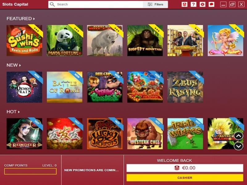 Slots Capital 由 BetSoft, Genesis Gaming, Rival, Saucify, Arrows Edge, Radi8 Games, Woohoo Games, Qora Games, Genii, Wager Gaming, Dragon Gaming and Dragoon Soft提供支持,這使得它能夠為客戶提供一系列桌上遊戲、老虎機和特色遊戲。Slot machines