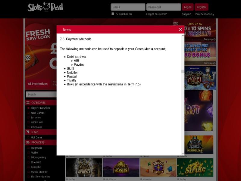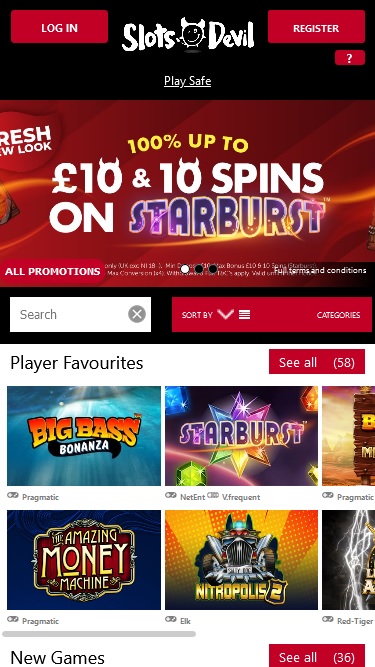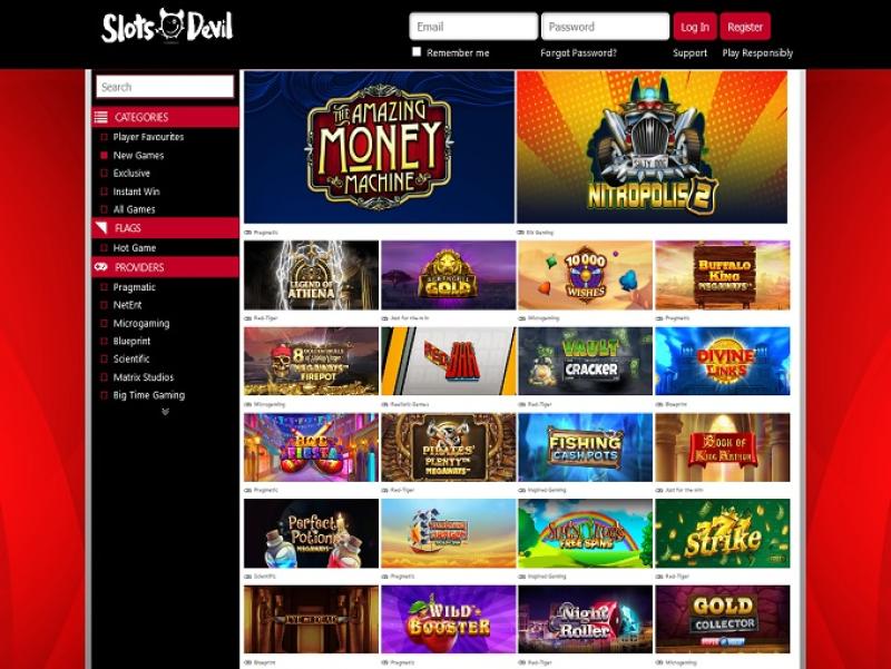 Slots Devil Casino 由 Microgaming, Net Entertainment, Big Time Gaming, ELK Studios, EYECON, Habanero Systems, lightningboxgames, Realistic Games, Pragmatic Play, Red Tiger Gaming, Skillzzgaming, Triple Edge Studios, Northern Lights Gaming, Stormcraft Studios, All41 Studios, Neon Valley Studios, Golden Rock Studios, Buck Stakes Entertainment, Games Global, Blueprint Gaming, Merkur Gaming, NextGen, NYX Interactive, Inspired Gaming, Scientific Games, Iron Dog Studio, Foxium, Just For The Win, Slingshot Studios, 4ThePlayer, Crazy Tooth Studio, Alchemy Gaming, Snowborn Games, Hacksaw Gaming and Aurum Signature Studios提供支持,其遊戲透過基於網頁的即時遊戲平台提供,玩家可以透過電腦的互聯網瀏覽器直接加載遊戲。該網站還支援行動端遊戲,玩家可以透過智慧型手機和平板電腦進行投注。