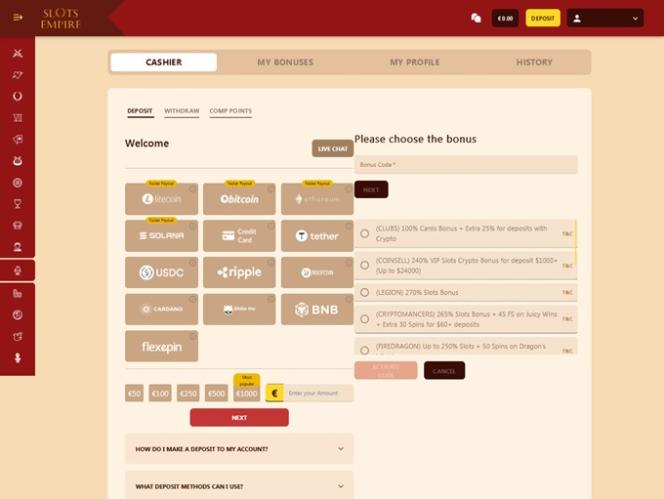 Slots Empire Casino 是一個線上博彩網站,自 2019 年起營運。該賭場服務於美國博彩市場,是 El Royale 和 Red Dog 的姊妹網站。它採用 RTG 軟體,外觀精美,潛力巨大,但較高的最低提款額可能會讓一些玩家望而卻步。