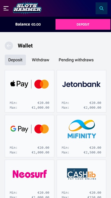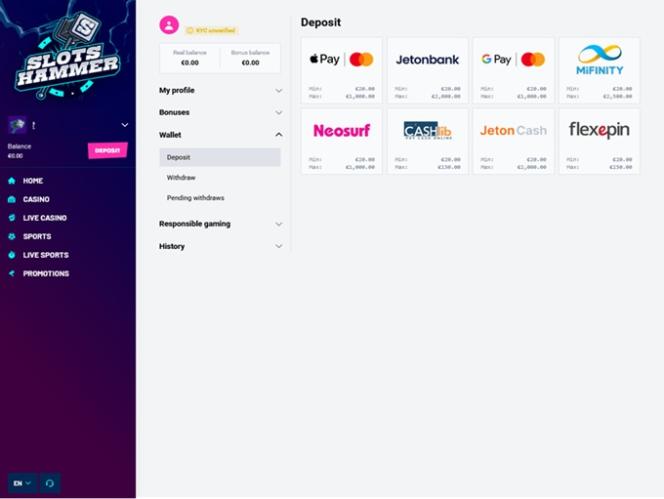 在 Slots Hammer 進行存款和提款時,玩家可以使用各種銀行方式,包括Visa 、 Mastercard 、 Skrill 、 Neteller 、 Apple Pay 、銀行電匯、 MiFinity和Flexepin 。