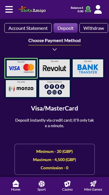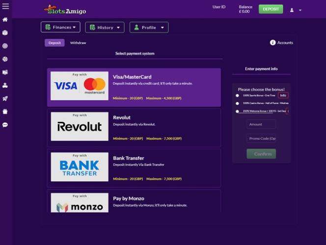 SlotsAmigo 是一家功能全面的線上賭場,主要針對英國玩家,提供豐富的博彩遊戲選擇,包括真錢老虎機、真人荷官、桌上遊戲和迷你遊戲,以及眾多體育博彩和虛擬體育選項。玩家可以享受促銷、獎金和活動,同時還可以使用傳統銀行業務或現代加密貨幣方式管理資金。