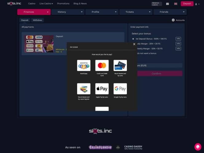 說到賭場出納員和玩家可用於交易的銀行業務方式,Slots.inc 憑藉其出色的選擇脫穎而出。賭場提供多種安全且廣泛使用的支付系統,例如借記卡和信用卡、電子錢包、直接銀行電匯…
