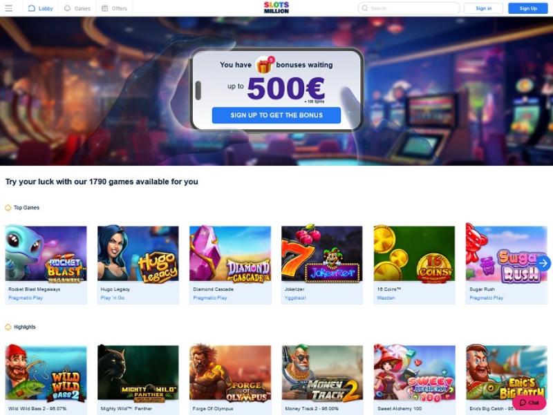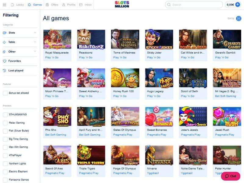 SlotsMillion 賭場由 BetSoft, Amatic Industries, Big Time Gaming, Play'n GO, Relax Gaming, Yggdrasil, Wazdan, Stakelogic, Pragmatic Play, Felt Gaming, Fugaso, Fantasma Games, Northern Lights Gaming, Electric Elephant Games, Blue Guru Games, Storm Gaming Technology, Wild Streak Gaming, Jade Rabbit Gaming, STHLM Gaming, 4ThePlayer, AGS Interactive, Max Win Gaming, SilverBack Gaming and Peter And Sons提供支持,為玩家提供超過一千種不同的遊戲。這些遊戲透過網路平台提供,您可以直接透過網頁瀏覽器暢玩。無需下載。