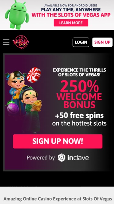 Slots of Vegas Casino 由 Real Time Gaming and Spinlogic Gaming提供支持,讓玩家有機會透過可下載的軟體和基於網路的平台存取賭場,並可以透過網路瀏覽器進行遊戲。Baccarat