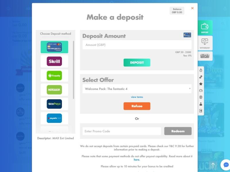 Slotty Vegas 的銀行服務非常棒,存款和提款可透過 Visa、MasterCard、WebMoney、Skrill、Neteller、JCB、Maestro 和電匯進行。存款也可透過 SOFORT、Moneta.ru、Paysafecard、ClickandBuy 和 PugglePay 進行。提款處理時間僅 4 小時,之後電子錢包付款將立即處理。銀行卡和電匯轉帳需要多幾天時間,但速度仍然很快。每月提款限額為 25,000 歐元,但目前尚不清楚累積獎金是否也受此限制。