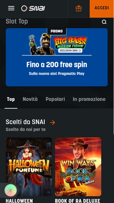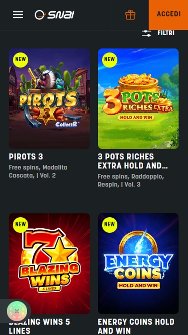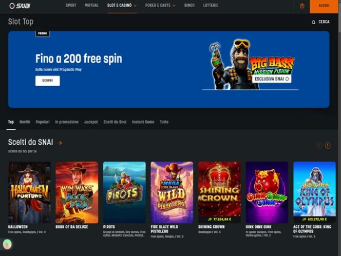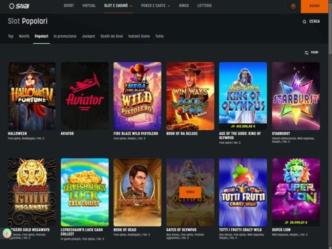 SNAI 由 Microgaming, Net Entertainment, Playtech, BetSoft, 1x2gaming, Barcrest, Big Time Gaming, ELK Studios, Espresso Games, Evolution Gaming, Habanero Systems, iSoftBet, lightningboxgames, Novomatic, Oryx, Play'n GO, playson, Quickspin, Rabcat, Relax Gaming, Thunderkick, WM, Yggdrasil, Endorphina, GameArt, Booming Games, Pragmatic Play, Nolimit City, Red Tiger Gaming, IGT, Fantasma Games, SYNOT Games, Skywind, Spinmatic, Triple Edge Studios, Fazi, Stormcraft Studios, Pocket Games Soft, All41 Studios, Gluck Games, Gameburger Studios, Neon Valley Studios, Shuffle Master, SpinPlay Games, SmartSoft Gaming, Eurasian Gaming, Games Global, Amusnet Interactive, Ash Gaming, Bally Technologies, Blueprint Gaming, Greentube, Leander Games, Merkur Gaming, NextGen, WMS, Inspired Gaming, Gaming Realms, SG Interactive, Gamomat, Red7Mobile, Scientific Games, Reel Time Gaming, Capecod Gaming, Foxium, Betdigital, Just For The Win, PearFiction Studios, Wild Streak Gaming, Fortune Factory Studios, RubyPlay, 4ThePlayer, AvatarUX, Gamevy, ReelPlay, Rarestone Gaming, Snowborn Games, Lucksome Gaming, Area Vegas, RAW iGaming, Spribe, Nailed It! Games, Reel Kingdom, Nazionale Elettronica and Light & Wonder提供支持,賭場遊戲由基於網頁的即時遊戲平台提供支持,可直接透過您的網路瀏覽器載入。無需下載繁瑣的軟體到您的電腦。該網站還支援手機遊戲,您可以透過智慧型手機和平板電腦暢玩。