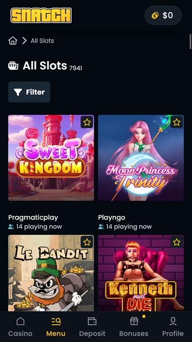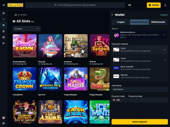 該博彩品牌主要針對加拿大、紐西蘭、挪威和德國的客戶。 Snatch Casino 為他們以及所有其他可能加入社群的國際玩家提供了一個現代化、設計精美的線上賭場平台。