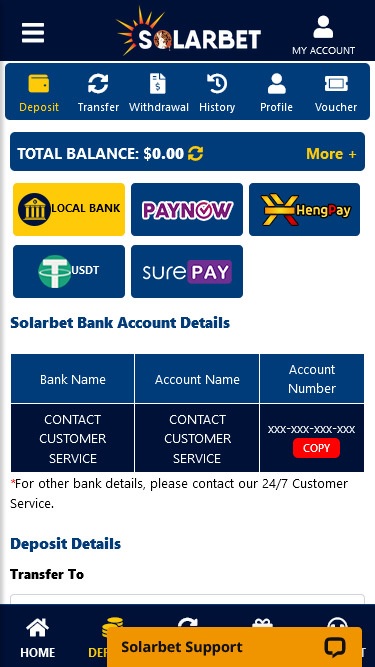 說到銀行選項,Solarbet Casino 為玩家提供的選擇並不多。他們可以使用銀行電匯和 Tether 進行存款,不過似乎也設定了其他一些選項以備將來使用。