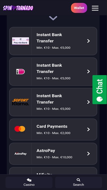 賭場收銀台支援加密貨幣支付以及各種常用的付款方式,包括信用卡、金融卡、即時銀行、銀行電匯等。請注意,某些網路銀行系統因國家/地區而異,因此請確保選擇最適合您所在地區和需求的付款方式。