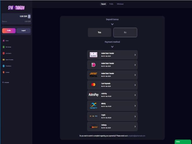 Banking銀⾏業務選項 的 Spin Tornado Casino