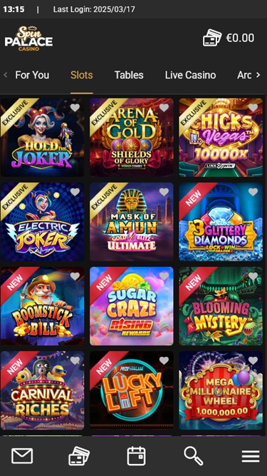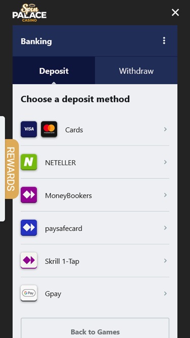 Spin Palace 賭場由 Microgaming, Net Entertainment, Evolution Gaming, Pragmatic Play, Red Tiger Gaming, Triple Edge Studios, Northern Lights Gaming, Stormcraft Studios, Switch Studios, All41 Studios, Gameburger Studios, Pulse 8 Studios, Neon Valley Studios, SpinPlay Games, Real Dealer Studios, GONG Gaming, On Air Entertainment, Buck Stakes Entertainment, Games Global, Old Skool Studios, Foxium, Just For The Win, PearFiction Studios, Wild Streak Gaming, Slingshot Studios, Fortune Factory Studios, Crazy Tooth Studio, Alchemy Gaming, Snowborn Games, Gold Coin Studios, Half Pixel Studios, Aurum Signature Studios, Area Vegas, Wishbone Games, Circular Arrow, HammerTime Games, INO Games, Nailed It! Games, Neko Games, Reel Kingdom and Oros Gaming提供支持,該平台透過可下載的用戶端軟體和即時遊戲平台為玩家提供大量遊戲庫,玩家可以透過網頁瀏覽器暢玩遊戲。此外,我們也提供行動賭場,方便玩家在智慧型手機或平板電腦上暢玩。
