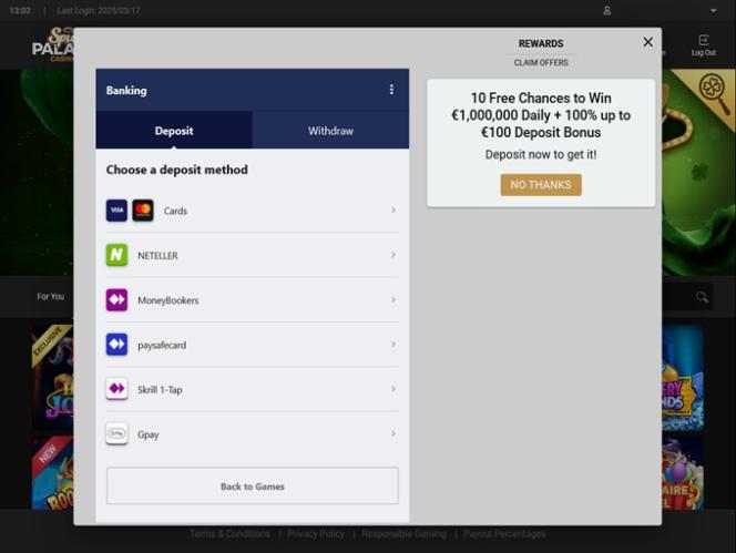 Spin Palace Casino 因涉嫌拖欠關聯方款項以及存在激進商業行為而聲譽不佳。鑑於這些擔憂,玩家應謹慎行事,因為類似的行為可能會延伸到客戶帳戶。強烈建議選擇信譽更佳的替代方案。