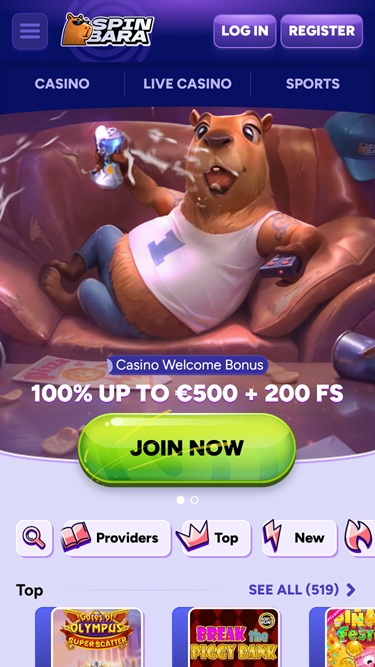 您一進入網站,就會看到一隻栩栩如生的水豚懶洋洋地躺在沙發上,享受著冰汽水。這奠定了整個網站的基調,並強調了您可以足不出戶,舒適地探索賭場所有功能的理念,這是一個非常貼心的小細節。