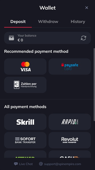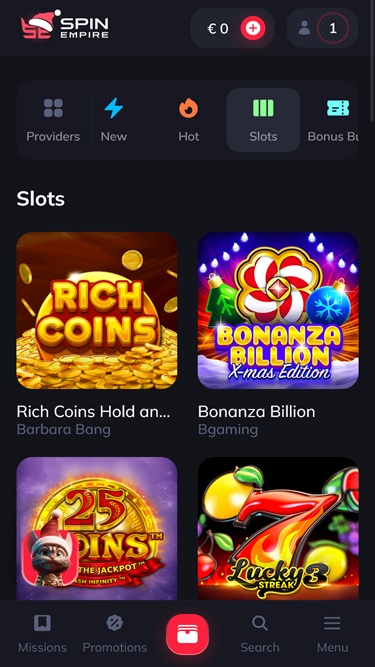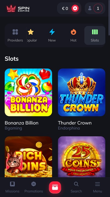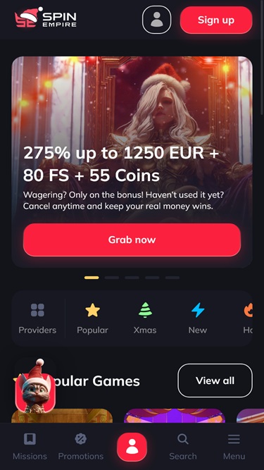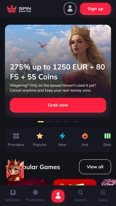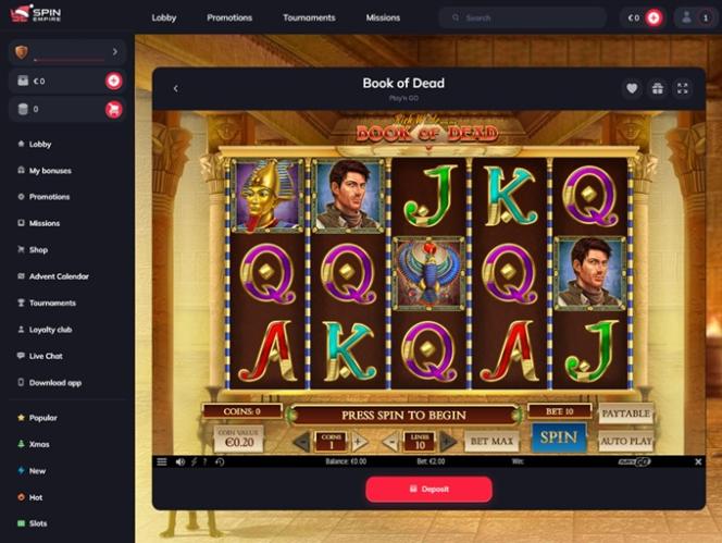 該網站提供英語、丹麥語、德語、法語和義大利語版本。它反應迅速,並針對各種螢幕尺寸的行動裝置進行了完美優化,讓您隨時隨地享受遊戲樂趣。如果您喜歡使用桌上型電腦,也能獲得絕佳的遊戲體驗。我們即將對賭場服務進行評測,敬請期待! SpinEmpire 為其賭場會員準備了精彩的促銷活動、錦標賽、忠誠度計劃以及更多福利。