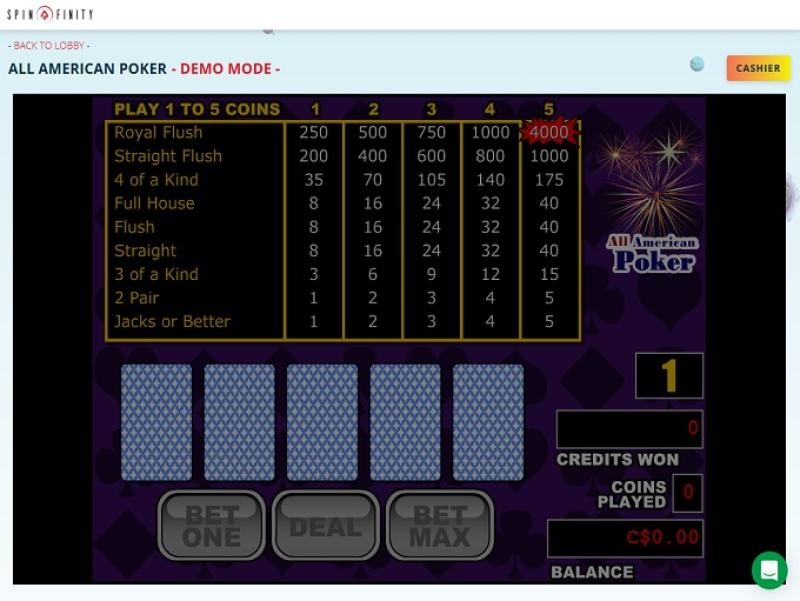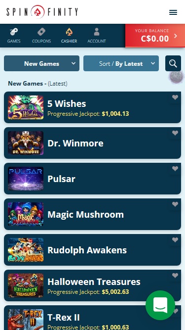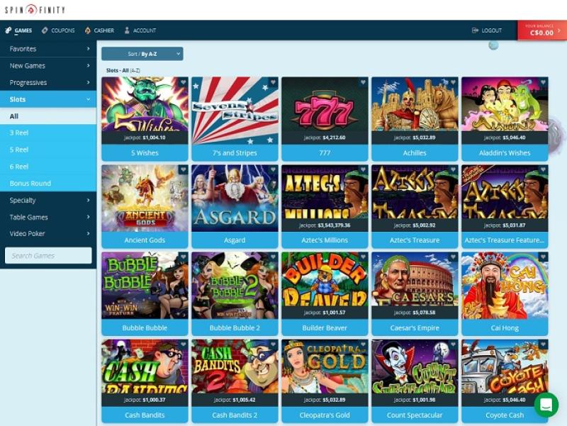 Spinfinity 提供數量可觀的視訊老虎機遊戲,因為該集團使用了 RTG 平台,許多美式賭場也使用這個平台。此外,他們還提供許多經典老虎機遊戲,例如三捲軸版本。此外,還提供累積獎金,並且大多數遊戲都相容於行動裝置。